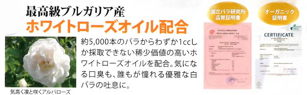 ホワイトローズオイルにより口臭は白バラの香りとなり、ホワイトニング+口臭ケア 2つの効果があります。