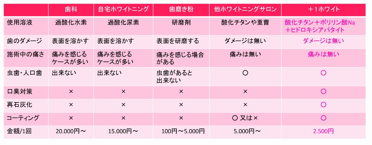 歯科で行なわれるホワイトニングは歯に塗布する溶液に「過酸化水素」を使用しています。 しかし、+1ホワイトは「酸化チタン+ポリリン酸Na」を配合し「光触媒+最新ホワイトニングシステム」を活用しています。ポリリン酸Naは汚れや黄ばみを剥がして包み込み酸化チタンは日光や蛍光灯が当たるだけで、有機物や細菌類を分解し歯の表面の汚れや着色成分・細菌を除去し、歯の元来の白さに戻していきます。 光触媒による除去後、ヒドロキシアパタイトが歯の凹凸に付着し再石灰化する事で表面がなめらかになり超親水性コーティング作用により、汚れや色素等を付着しにくくなり虫歯予防や白さを維持する作用があります。